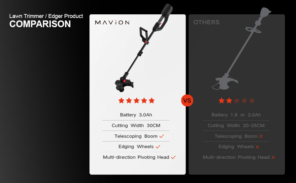 The MAVION 20V Cordless Lawn Grass Trimmer & Edger Kit is designed for garden enthusiasts and home users, combining powerful functionality with user-friendly features: 2-in-1 Design: Easily switch between trimming and edging modes with a simple adjustment, saving time and effort. Edging Wheels: Integrated guide wheels ensure precise and smooth edge cutting for a perfectly groomed lawn. Ergonomic Design: A 180° adjustable handle and telescoping boom minimize strain and enhance comfort during extended use. Multi-Angle Pivoting Head: Adjust the cutting head effortlessly to tackle corners, slopes, and other challenging areas. Wide Cutting Width: The 30cm cutting width covers larger areas quickly and efficiently. Powerful Performance: Powered by a 20V 3.0Ah battery and fast charger, it delivers long-lasting performance with minimal interruptions.